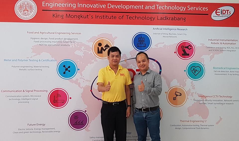 เมื่อวันที่ 11 ธันวาคม 2561 รศ. ดร.นวภัทรา หนูนาค หัวหน้าศูนย์พัฒนานวัตกรรมฯ (EIDTs) รศ. ดร.ทวีพล ซื่อสัตย์ เเละ คุณสมนึก ศิริจรัสวงศ์ ที่ปรึกษาศูนย์ EIDTs ได้สัมภาษณ์โครงการวิจัยเงินรายได้ประจำปีงบประมาณ 2562 ณ ศูนย์ EIDTs คณะวิศวกรรมศาสตร์ สถาบันเทคโนโลยีพระจอมเกล้าเจ้าคุณทหารลาดกระบัง.