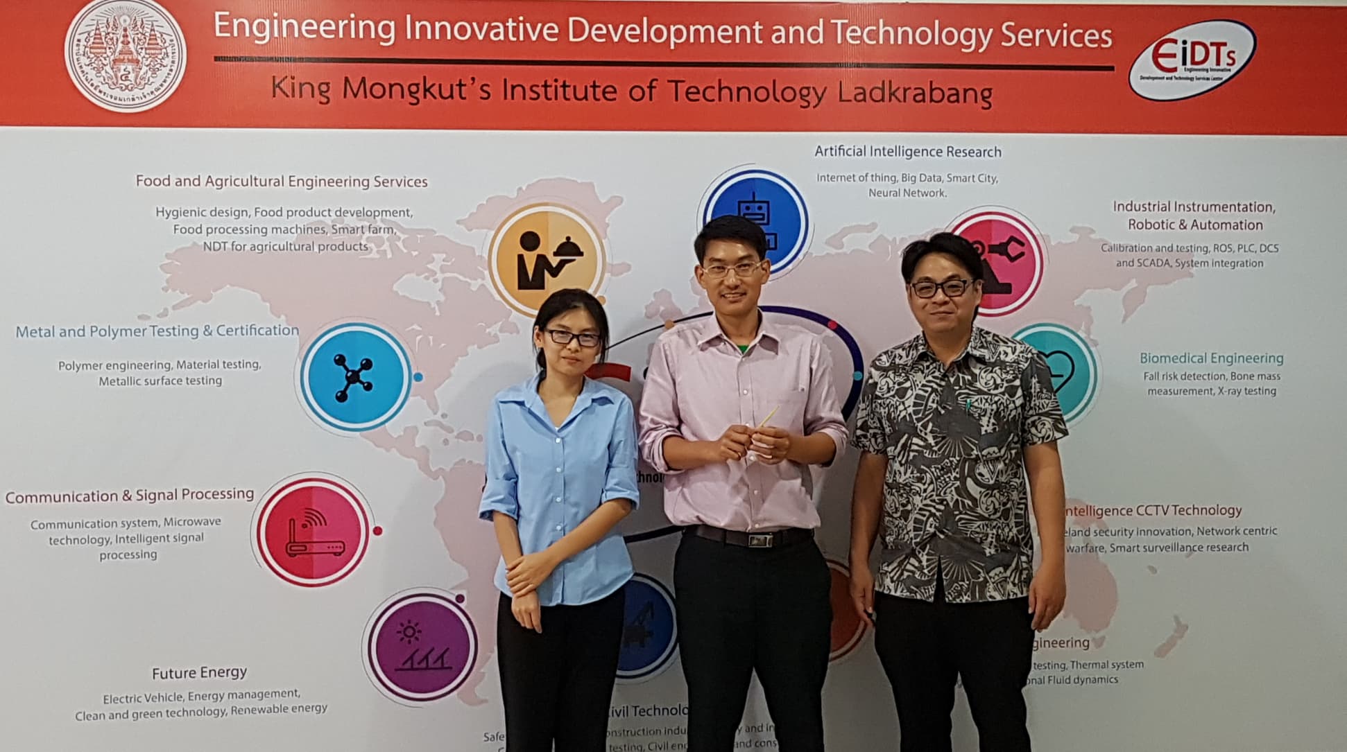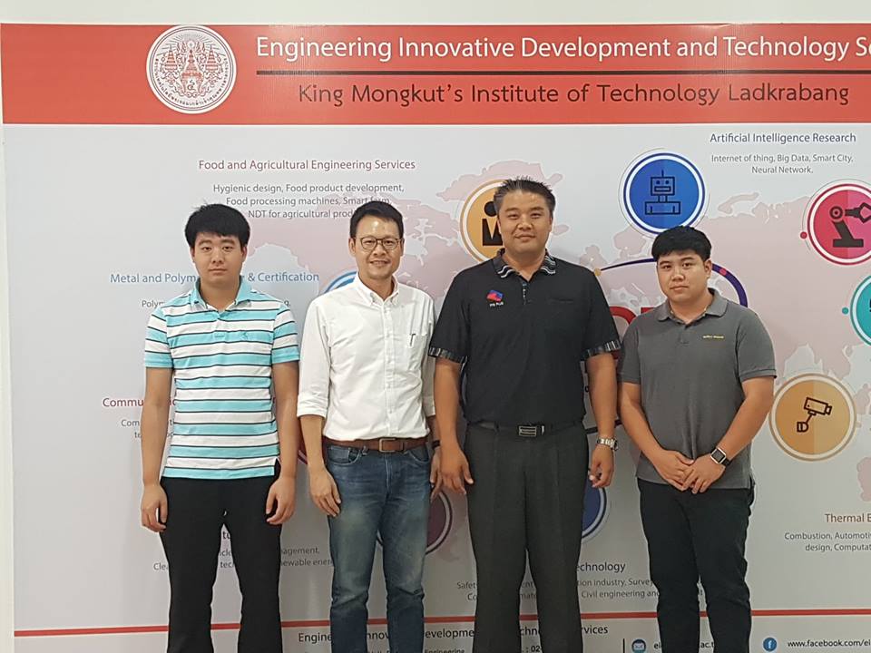 เมื่อวันที่ 7 พฤศจิกายน ตุลาคม 2561 รศ. ดร.นวภัทรา หนูนาค หัวหน้าศูนย์พัฒนานวัตกรรมเเละบริการทางวิศวกรรม (EIDTS) เเละ รศ. ดร.ทวีพล ซื่อสัตย์ คุณสมนึก ศิริจรัสวงศ์ ที่ปรึกษาศูนย์ EIDTS คุยงานวิจัยร่วมกับ ThaiGerTec Co., Ltd. ณ ศูนย์ EIDTs คณะวิศวกรรมศาสตร์ สจล.